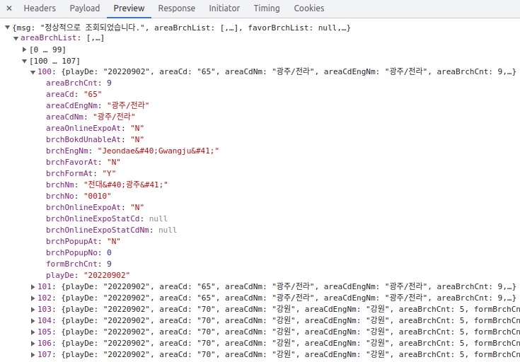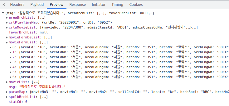 추가로 메가박스 모든 상영관 정보가 필요하면 다른작업 필요없이 areaBrchList를 그냥 복붙하시면 됩니다.
