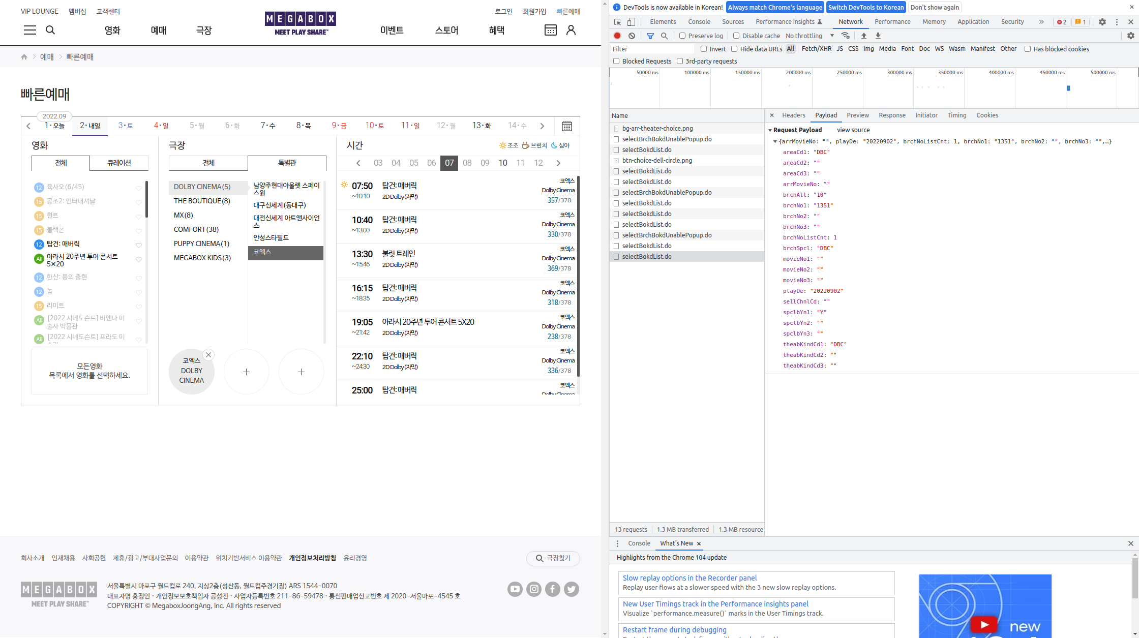 메가박스 사이트에서 "빠른예매"를 들어가 영화랑 상영관을 선택하면 메가박스사이트는 selectBokdList.do에 질의를 보내는걸 알 수 있습니다.