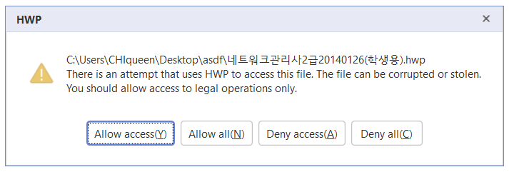 그리고 듀얼모니터를 써서 안나왔지만 한글이 실행되면서 아래와 같은 경고문이 뜬다.