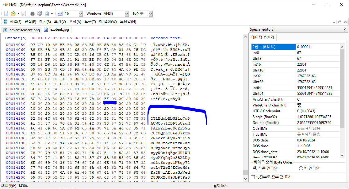 밑을 보면 FF D9 이후로 뭐라 블라블라있는데 base58이다.